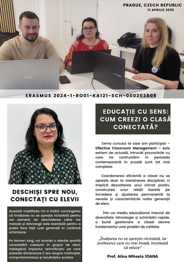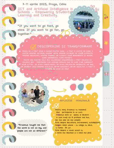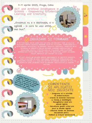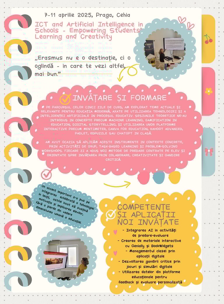 Mi -a placut foarte mult modul cum s-a desfășurat programul de învățare. Formatoarea, o profesionistă deosebit de empatică, ne-a explicat foarte clar ceea ce aveam de realizat și la șfărșitul programului, după evaluarea sarcinilor din ziua respectivă, eram mulţumită că reușeam să rezolv toate aplicațiile de lucru. Am învățat multe lucruri noi din domeniul educaţiei digitale: instrumente digitale pentru lecţii interactive şi pentru proiectarea materialelor de învăţare (Padlet, Copilot, Curipod, Nearpod, Canva, Microsoft designer,Chat GPT), instrumente digitale pentru evaluare (Quizalize, Plickers, Flip). Competențele digitale însușite în cadrul acestei mobilități de formare profesională, mă vor ajuta în viitor, atunci când voi desfăţura lecţiile cu elevii mei. Cursul a fost o oportunitate binevenită atât de învățare, cât și de împărtășire a experiențelor cu colegii care nu au beneficiat de mobilitate. Învățarea unor instrumente şi aplicaţii digitale noi și implementarea acestora în procesul de învățare vor face lecțiile mai atractive și îi va ajuta pe elevi în procesul de integrare. A fost pentru mine o experienţă divină, densă, interculturală deosebită .