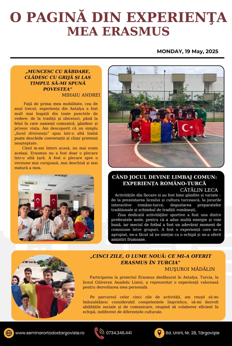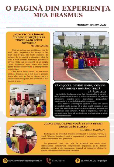 În perioada 21-27 aprilie 2024, cu binecuvântarea Înaltpreasfințitului Părinte Arhiepiscop și Mitropolit Nifon, am participat la o mobilitate de tipul job shadowing în cadrul Agrupamento de Escolas din Barcelos. Am avut ocazia să cunosc modul de funcționare al sistemului de învățământ portughez, specializările din cadrul acestei școli, materiile studiate, aspecte teoretice și practice ale programelor școlare. Am asistat la ore de curs, urmărind modul de predare, capacitatea elevilor de a aplica în situații practice cunoștințele dobândite (folosirea unor instrumente software, vorbire în public, discuții, dezbateri, activități, prezentări, proiecte de grup, creativitatea cadrelor didactice, calitatea temelor). Mobilitatea a avut și o componentă culturală deosebit de interesantă. Alături de elevi și cadre didactice din alte orașe din România, dar și din Turcia, am participat la excursii tematice la Porto și Braga, dar și la activități specifice legate de Ziua Portugaliei (25 aprilie).