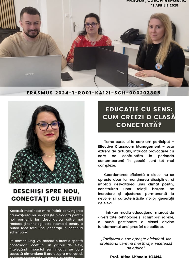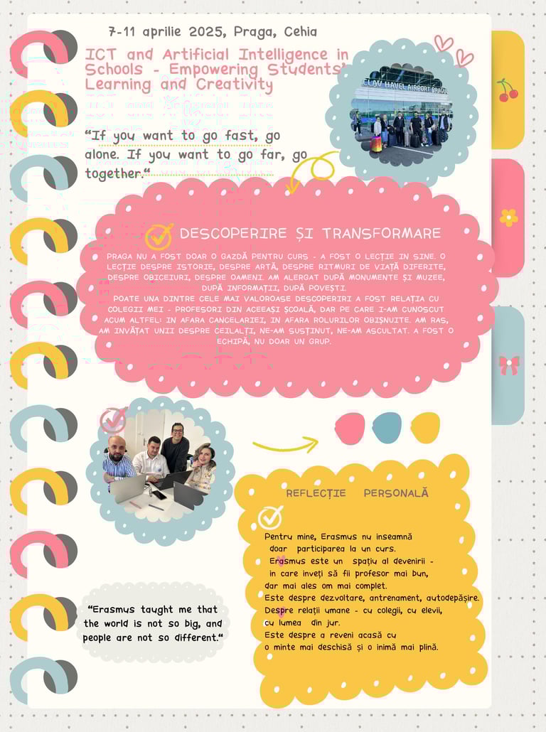 Mi -a placut foarte mult modul cum s-a desfășurat programul de învățare. Formatorul, ne explica foarte clar ceea ce aveam de realizat și la șfărșitul programului eram mulţumită că reușeam să rezolv toate sarcinile de lucru. Am invățat multe lucruri noi din domeniul educaţiei digitale: instrumente digitale pentru lecţii interactive şi pentru proiectarea materialelor de învăţare (padlet, copilot, curipod, nearpod, canva, microsoft designer,Chat GPT) , instrumente digitale pentru evaluare (quizalize, plickers, flip) , cu siguranță, ceea ce am dobândit în cadrul acestei mobilități de formare profesională, mă va ajuta în viitor, atunci cand voi desfăţura lecţiile cu elevii mei. Cursul a fost o oportunitate binevenită atât de învățare, cât și de împărtășire a experiențelor cu colegii care nu au beneficiat de mobilitate. Învățarea unor instrumente şi aplicaţii digitale noi și implementarea acestora în procesul de învățare vor face școala mai atractivă și îi va ajuta pe elevi în procesul de integrare. A fost pentru mine o experienţă unică, de o complexitate deosebită .