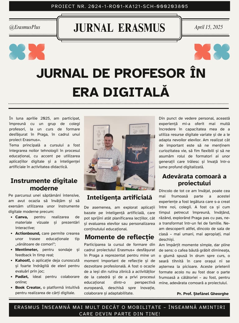 În perioada 19-24 februarie 2024 am participat la Cursul ”The Digital Teacher: A21- Century Introduction tot Digital Education „Mobilitate Erasmus+2023-1-RO01-KA121-SCH-0000124912- desfăşurat la Florenţa – Italia. Acest curs a reprezentat pentru mine, profesor de literatura română, o oportunitate de a participa la un curs de digitalizare, cât și o provocare. Sunt recunoscătoare si încântată de această oportunitate, pentru că am avut posibilitatea de a lua parte la un program de formare profesională în domeniul educaţiei digitale, am avut ocazia să vizitez numeroase obiective turistice si culturale reprezentative ale Renașterii universale, din Florenţa şi împrejurimi, care m-au impresionat si plăcut foarte mult, am participat la anumite schimburi interculturale cu profesori din alte ţări, mi-am îmbunătățit abilitățile de comunicare în limba engleză şi în domeniul educaţiei digitale. Acest curs a spart barierele etnice, rasiste, culturale și ne-a învățat o nouă definiție interculturalității și a protejării mediului înconjurător.