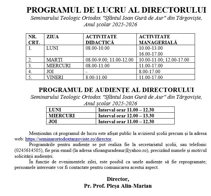 Seminarul Teologic Ortodox „Sfântul Ioan Gură de Aur" din Târgoviște este o școală a misiunii creștine în societatea timpului nostru, spre a oferi oameni pregătiți să transmită și să păstreze valorile axiologice care generează și aprofundează binele, adevărul și frumosul.